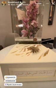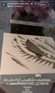 وشاركت أندريا طايع صورة من داخل فندق إقامتها، بالتزامن مع مشاركة شكران مرتجى التي عبّرت عن امتنانها لحفاوة الاستقبال، حيث ظهرت الهدية الرسمية الخاصة بـ Joy Awards. كما نشرت غدير السبتي صورة مشابهة مؤكدة سعادتها بالمشاركة للعام الثاني على التوالي.