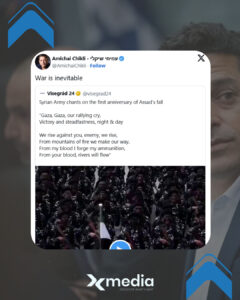 ونشر شيكلي على منصة “إكس” تدوينة مقتضبة أرفقها بالمقطع، كتب فيها: “الحرب حتمية”، في إشارة مباشرة لاحتمال مواجهة عسكرية مفتوحة على الجبهة الشمالية مع سوريا.